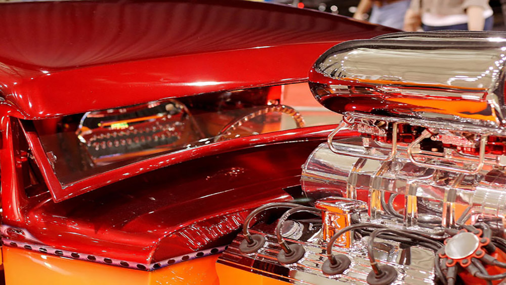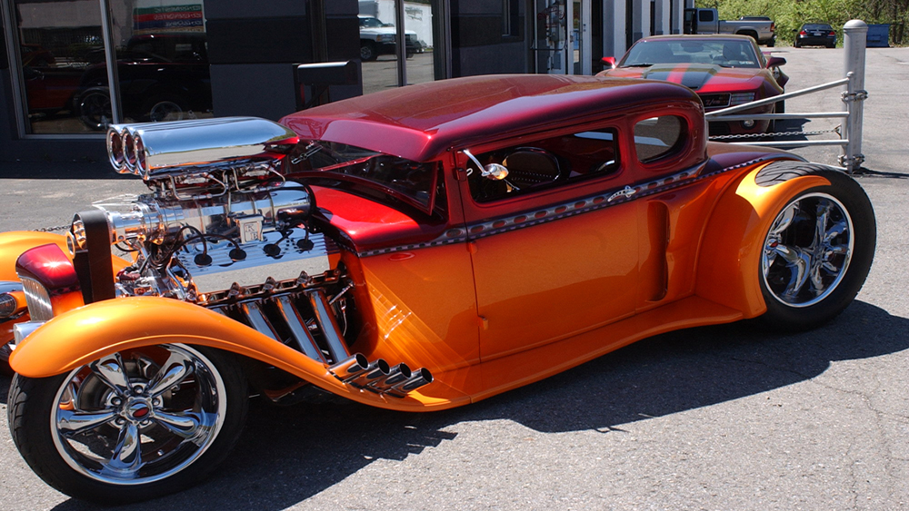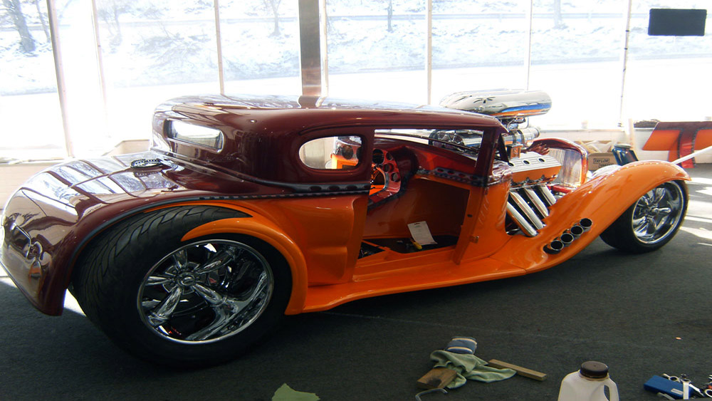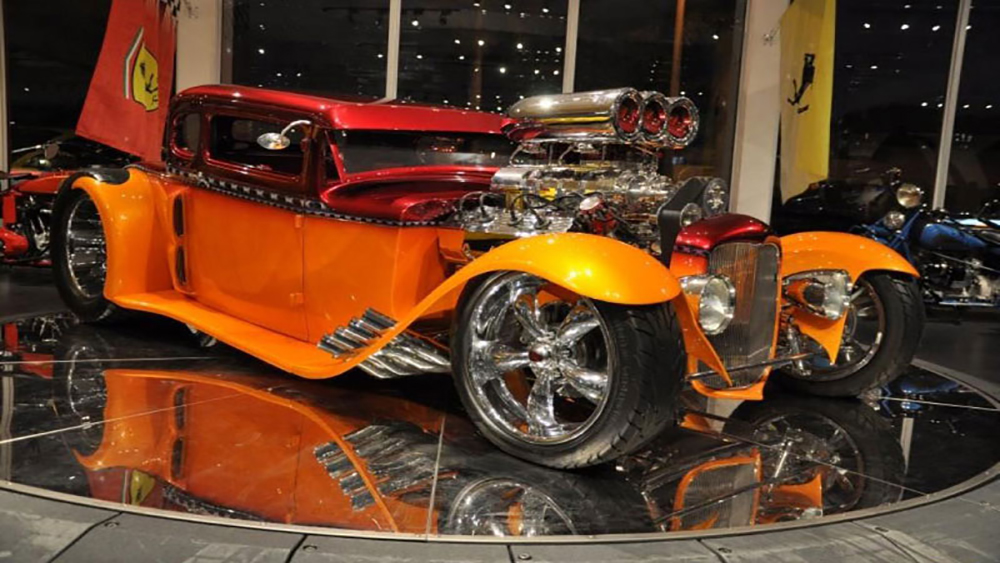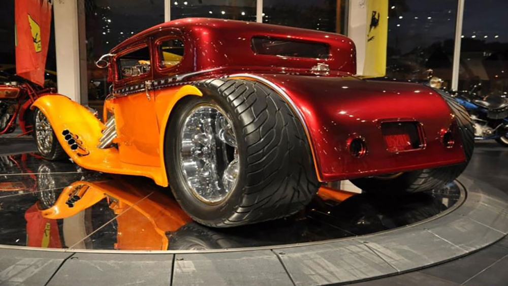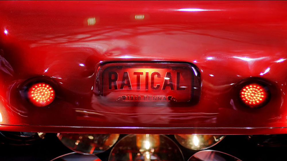 With its two-tone red and orange paint job, custom cut rear fenders, 4" chopped body, and channeled and sectioned 8" wider, Ratical Rod is truly one-of-a-kind!