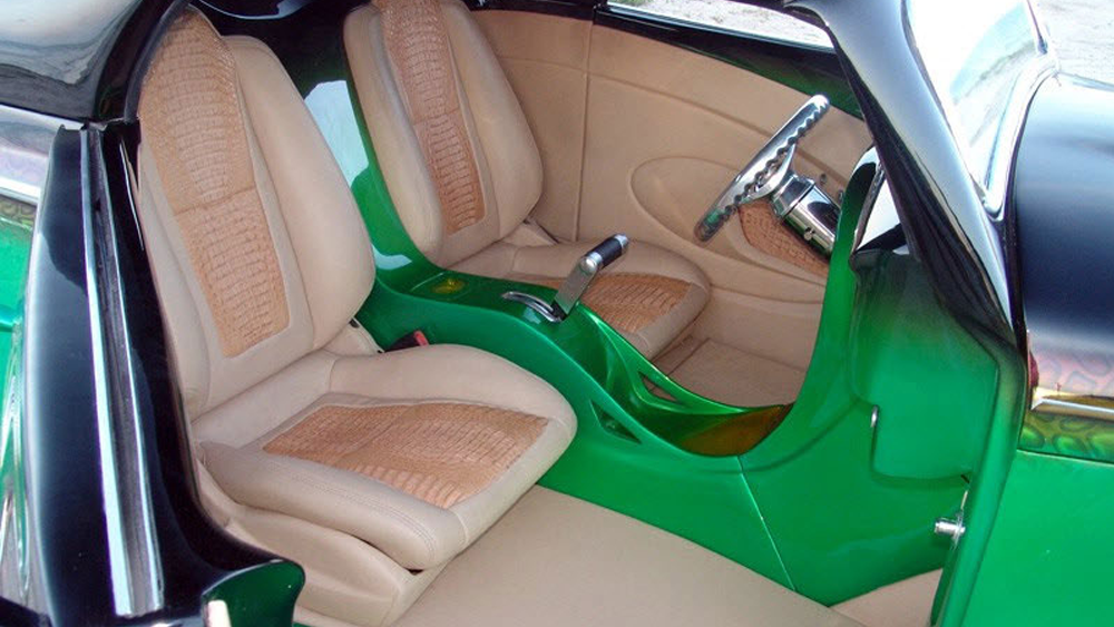 Custom interior and dash, Toyota Supra bucket seats, alligator hide accents, and a hidden sound system.