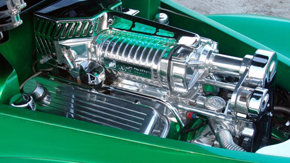 540 CID Merlin engine, custom motor mounts, custom Be Cool radiator, a polished Whipple supercharger with 55 pound injectors, March pulleys, Mallory Electronic ignition, and Hooker headers flowing into a 3.5 inch HPC coated exhaust, twin Flowmaster mufflers, and a 4-speed, 4L80E automatic transmission. All this produces 750 horsepower.