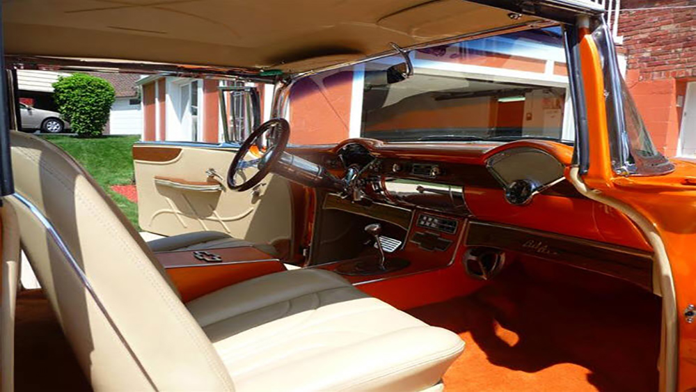 The Dupont tango effect orange draws people right to it. It has a 350 cubic inch, camelback heads, GM turbo 350 transmission, power steering, 4-wheel power disc brakes, chrome wheels 20x10 rear and 18x8 front, AC with Be Cool radiator and condenser, jet hot-coated headers, smooth firewall, dual chrome electric fans, engine compartment highly detailed in chrome, stainless hood hinges, front of frame filled and smoothed in black metal flake, 2” dropped spindles, rear suspension lowered, stainless exhaust. It also has a custom interior with bucket seats and console, polished lokar pedals, polished column, lokar shifter, Dakota digital dash, chrome door hinges, custom door handles and cranks with wood grain inserts, wood grain trim throughout interior, custom steering wheel in wood and chrome, headliner sculpted, smoke glass, custom finished trunk compartment with storage, smooth one-piece front bumper.