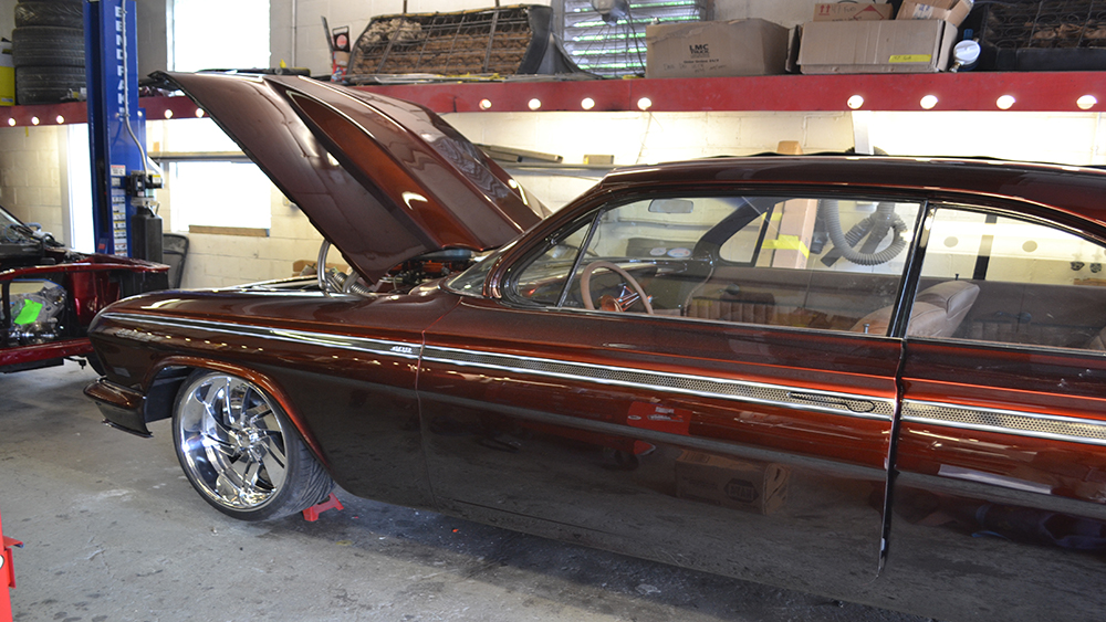 The customer wanted a fresh and updated look with a beautiful root beer color. We customized the console, narrowed the front bumper to hug the body, installed custom door handles, and custom fabricated the tops of the quarters and trunk. We removed all of the chrome and painted the grille, bumpers and custom U.S. Mags Phantom wheels. The paint is a custom blend House of Kolor Kandy tint with a unique chrome-effect graphic.