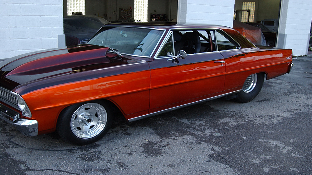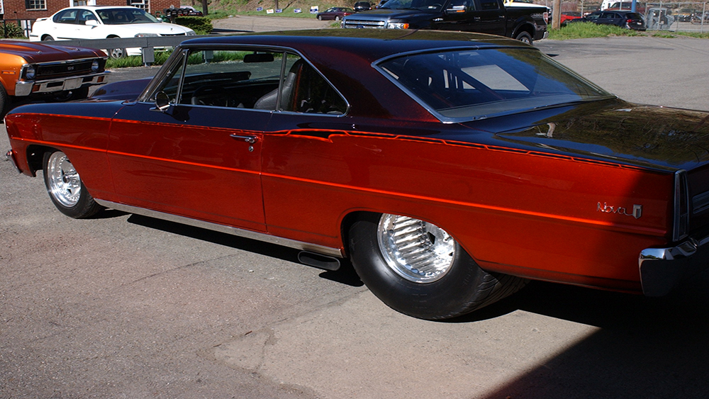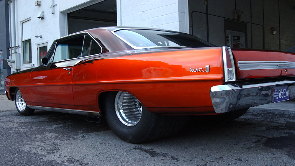 This Nova is fast enough to sneak up on you - except the engine has such a muscular sound there is no catching you off guard. The paint is a custom House of Kolor Tangerine Kandy with different underbases to produce the two-tone effect of tangerine and root beer.