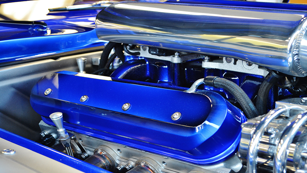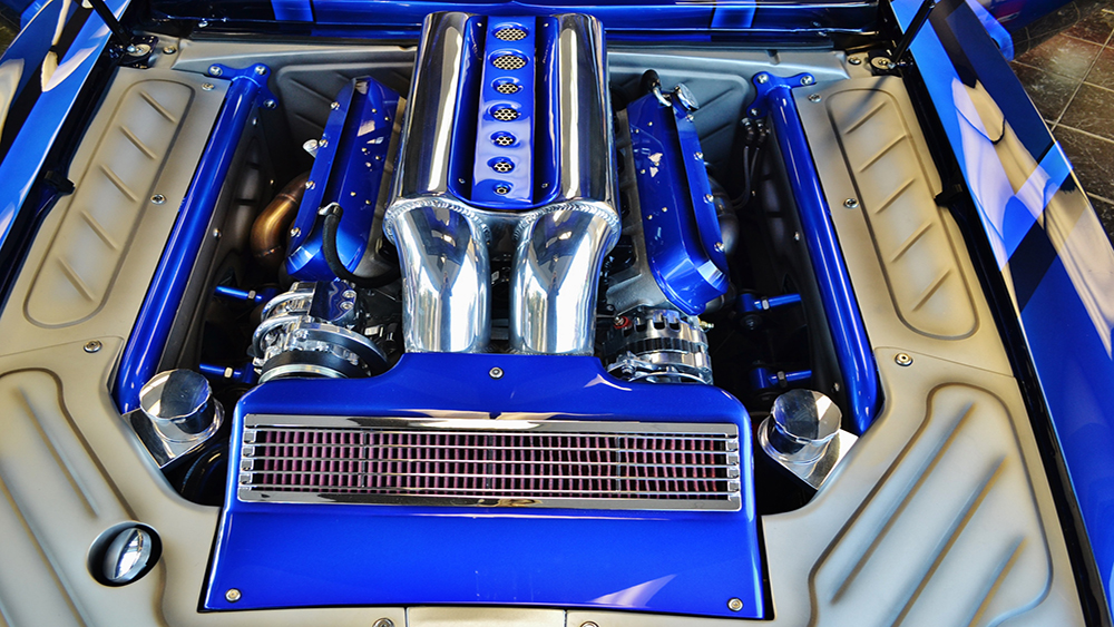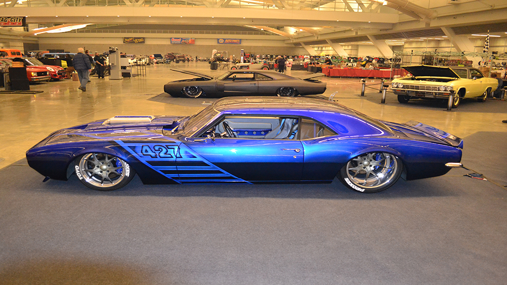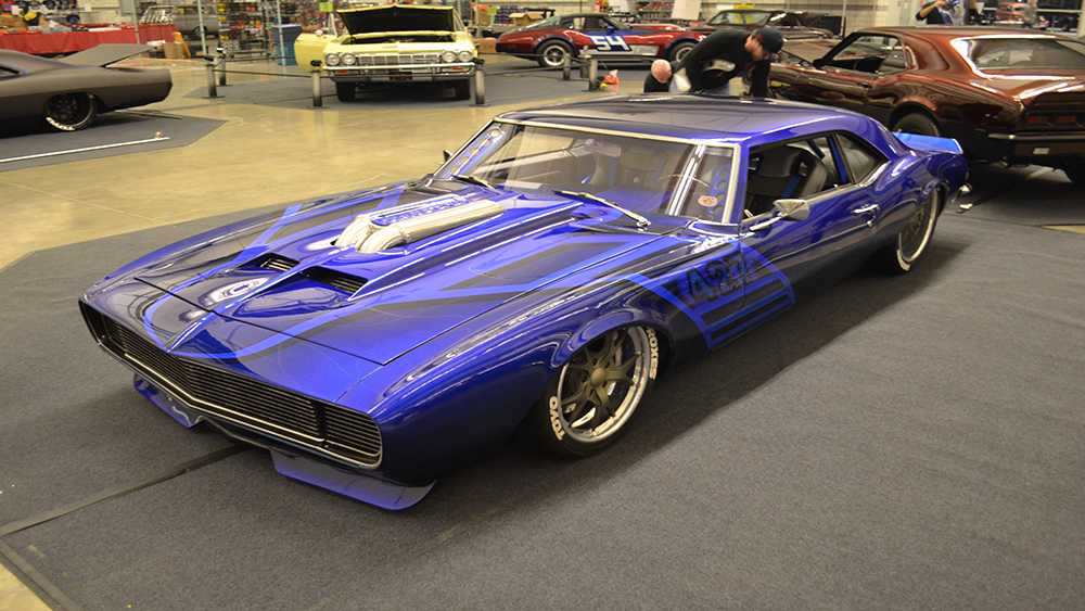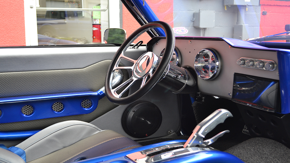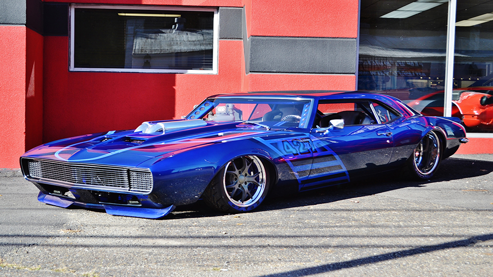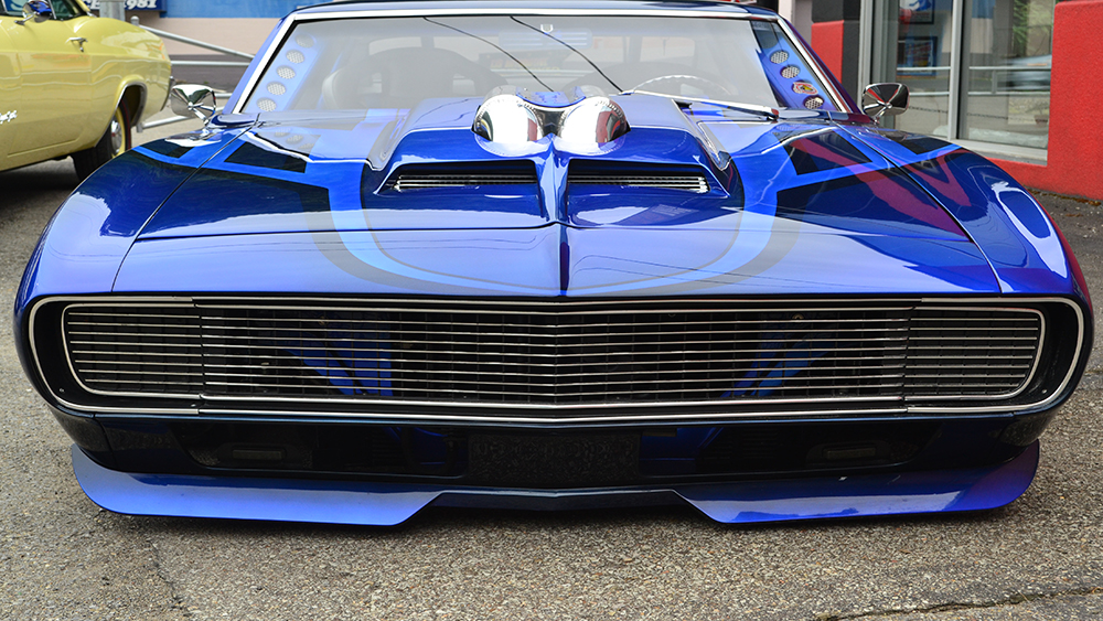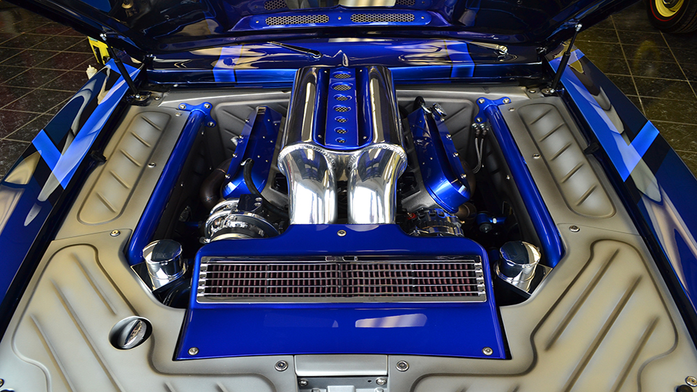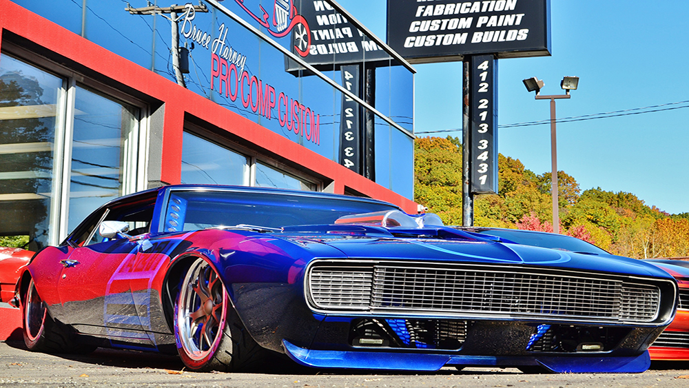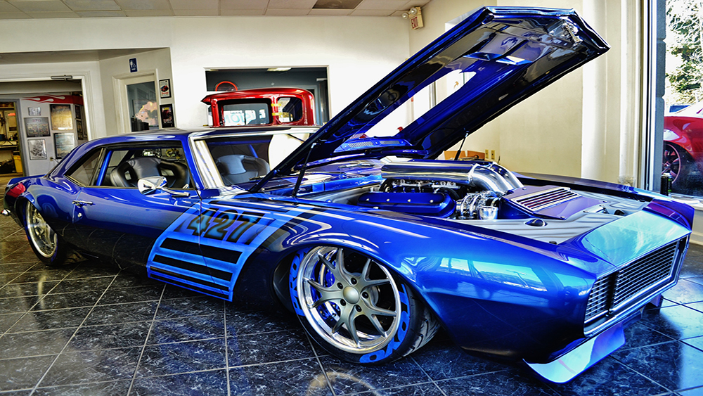 Bruce had a vision of taking a classic Camaro and turning it into a Supercar. The customer was open-minded to the extreme build and named her “My Kind of Crazy”. We chopped the roof 3”, lengthened the roof 3” and sectioned the body 3” and we were able to retain the body lines of the car and improve the look by making it a sleek 40” tall powerful machine. The two air intake scoops flow into two round tubes for an aggressive look. The entire floor is handmade of 18 gauge steel that we bead rolled to create the design. The upgraded Martz chassis was installed in a higher position to allow for more ground clearance. The engine bay is handmade out of .065 6061 aluminum with embossing to match the floor. The air cleaner is handmade out of aluminum and built to draw air out of the front of the hood. The handmade mid-length stainless steel headers lead to the custom fabricated oval-shaped exhaust designed for ground clearance.