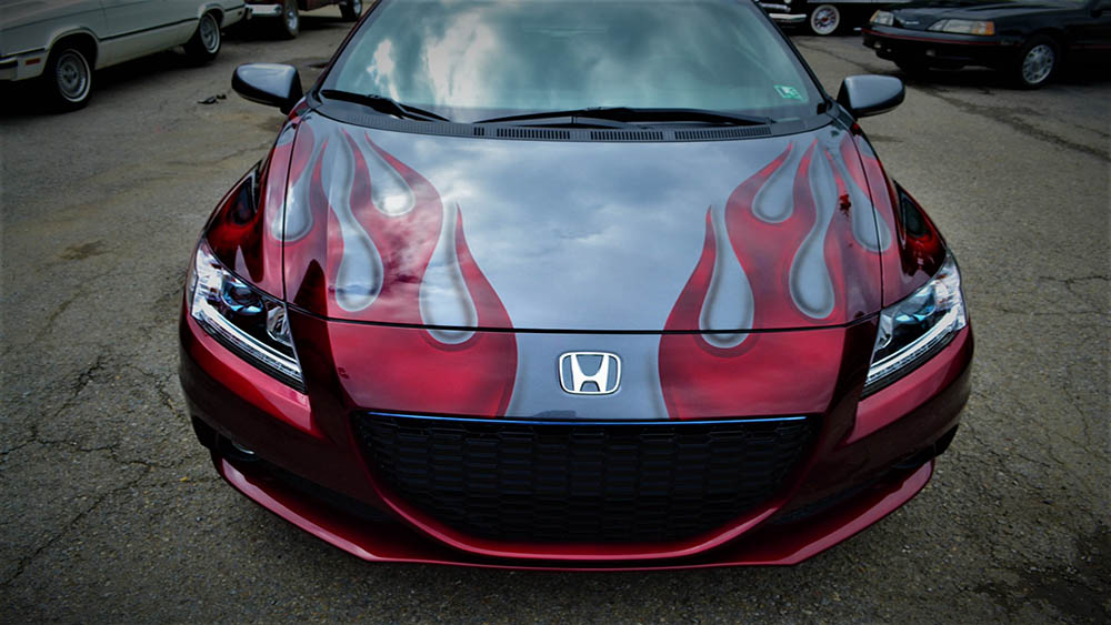 The customer wanted to jazz up his CR-Z with a fun paint job and fun he received! His car color is a “polished metal metallic” and Bruce painted his signature flames in Brandywine Kandy across the hood and body.